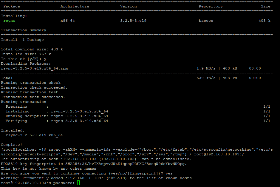 이 명령은 현재 시스템의 전체 파일을 192.168.10.103에 위치한 새로운 서버로 복사합니다. 중요한 점은, 일부 시스템 디렉터리와 설정 파일은 제외하여 충돌을 방지한다는 점입니다.