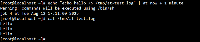 echo "echo hello >> /tmp/at-test.log" | at now + 1 minute