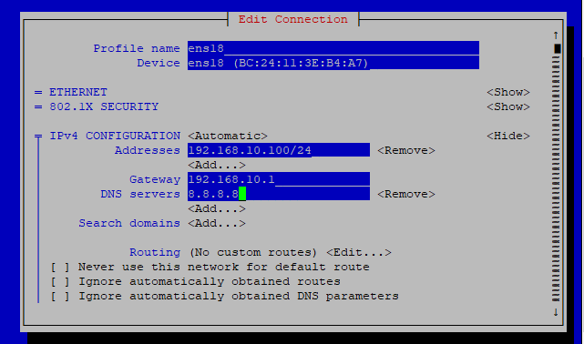 이더넷 카드가 나오는부분이다 나는 ens18 로 진입해 설정을 진행한다