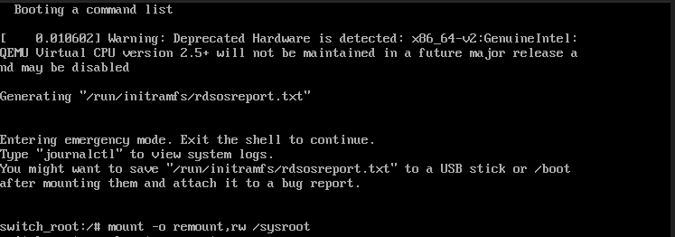 rd.break 모드로 부팅이 완료되면, 초기에는 파일 시스템이 읽기 전용(read-only) 상태로 마운트되어 있습니다. 패스워드를 변경하기 위해 파일 시스템을 읽고 쓸 수 있는(read-write) 상태로 다시 마운트해야 합니다.