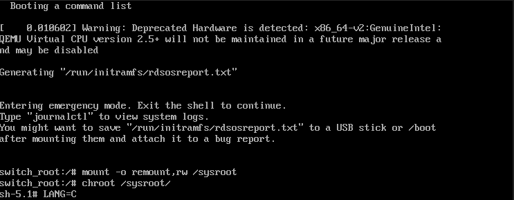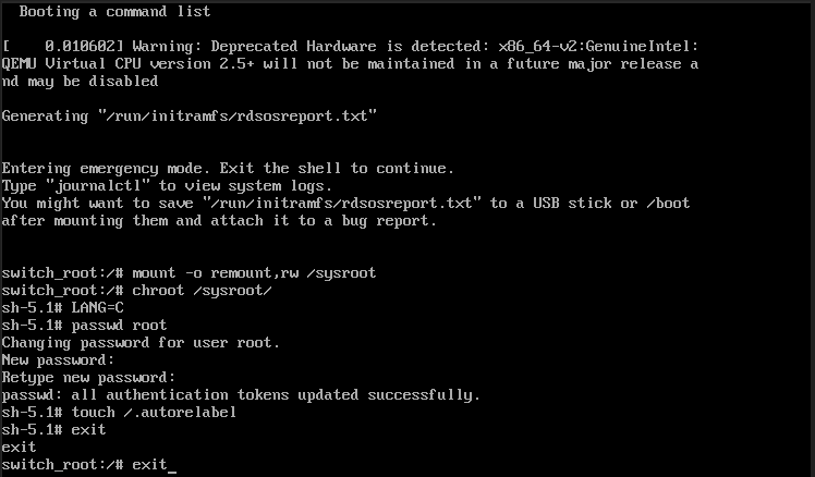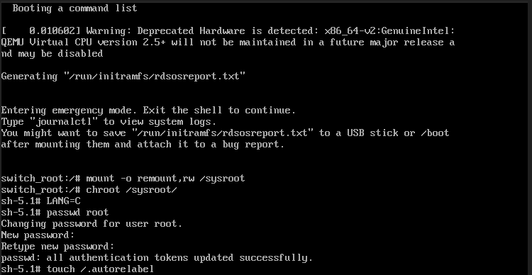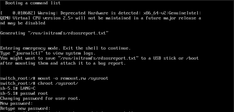 rd.break 모드로 부팅이 완료되면, 초기에는 파일 시스템이 읽기 전용(read-only) 상태로 마운트되어 있습니다. 패스워드를 변경하기 위해 파일 시스템을 읽고 쓸 수 있는(read-write) 상태로 다시 마운트해야 합니다.