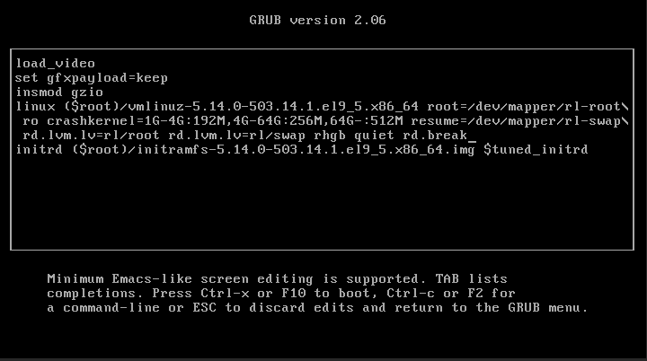 GRUB 수정 화면에서 키보드 방향키를 이용해 linux 로 시작하는 라인을 찾습니다. 해당 라인의 가장 끝으로 이동하여 한 칸 띄운 후 rd.break 를 추가로 입력합니다.